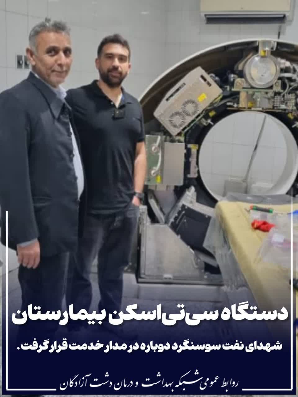 با یاری خداوند متعال و پیگیری‌های مجدانه، به اطلاع مردم شریف و ولایتمدار شهرستان دشت آزادگان می‌رساند که پس از مدتی وقفه، دستگاه سی‌تی‌اسکن بیمارستان شهدای نفت سوسنگرد مجدداً فعال و آماده خدمت‌رسانی به بیماران عزیز است.